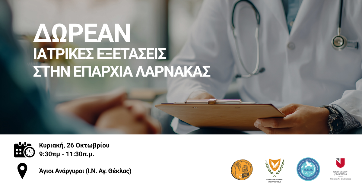 Συνεχίζεται την Κυριακή, 26 Οκτωβρίου, στον. Ι.Ν. Αγίας Θέκλας στη Λάρνακας, η εκστρατεία της ΠΕΠ και του Δήμου Λάρνακας, για τη διενέργεια δωρεάν ιατρικών εξετάσεων σε κατοίκους των συνοικισμών του Δήμου. Η εκστρατεία διεξάγεται σε συνεργασία με την Ιατρική Σχολή του Πανεπιστημίου Λευκωσίας και τις Οδοντιατρικές Υπηρεσίες του Υπουργείου Υγείας.