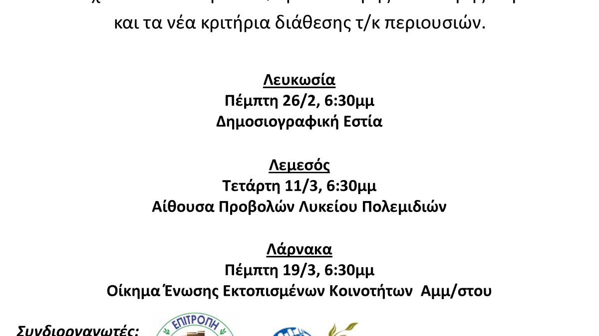 Ανοικτές παρουσιάσεις του νέου πλαισίου διαχείρισης τ/κ περιουσιών, των στεγαστικών σχεδίων της Υπηρεσίας Μέριμνας και