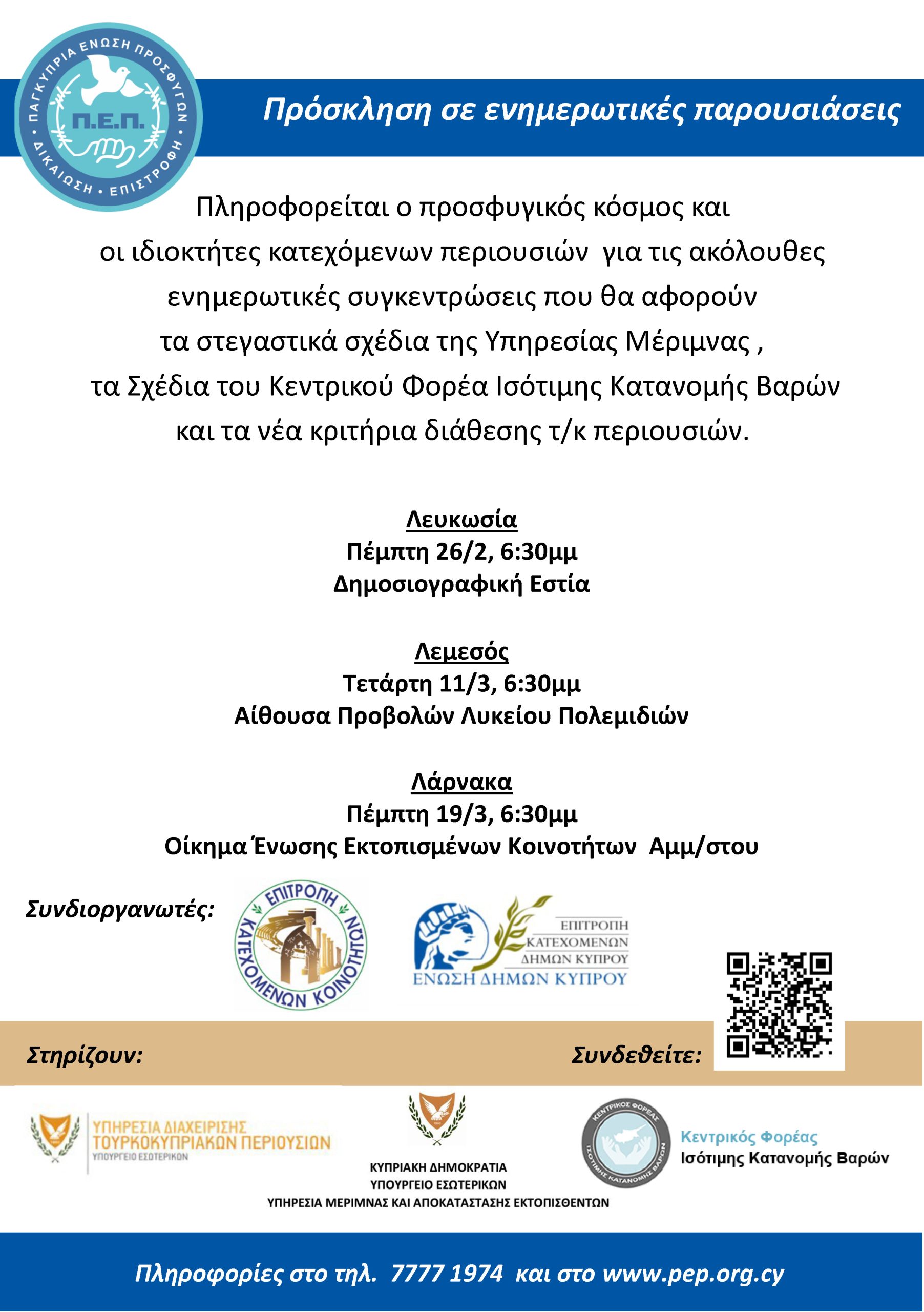 Η Παγκύπρια Ένωση Προσφύγων, πληροφορεί τον προσφυγικό κόσμο και τους ιδιοκτήτες τουρκοκρατούμενων περιοχών, ότι προχωρεί σε επαρχιακές ενημερωτικές παρουσιάσεις. Οι παρουσιάσεις θα αφορούν το νέο πλαίσιο διάθεσης και διαχείρισης τ/κ περιουσιών, τα στεγαστικά σχέδια της Υπηρεσίας Μέριμνας καθώς και τα δανειοδοτικά σχέδια του Κεντρικού Φορέα Ισότιμης Κατανομής Βαρών.